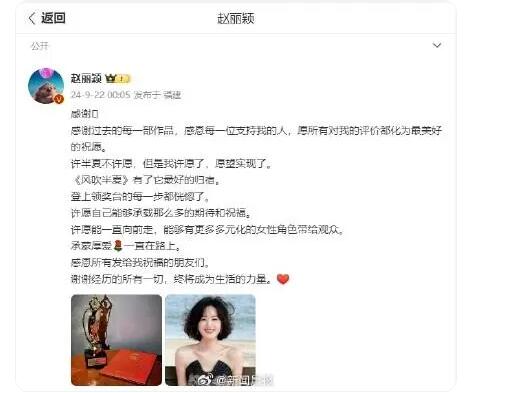 赵丽颖22日凌晨发文:“感谢过去的每一部作品,感恩每一位支持我的人,愿所有对我的评价都化为最美好的祝愿。许半夏不许愿,但是我许愿了,愿望实现了。《风吹半夏》有了它最好的归宿。登上领奖台的每一步都恍惚了。许愿自己能够承载那么多的期待和祝福。许愿能一直向前走,能够有更多多元化的女性角色带给观众。”