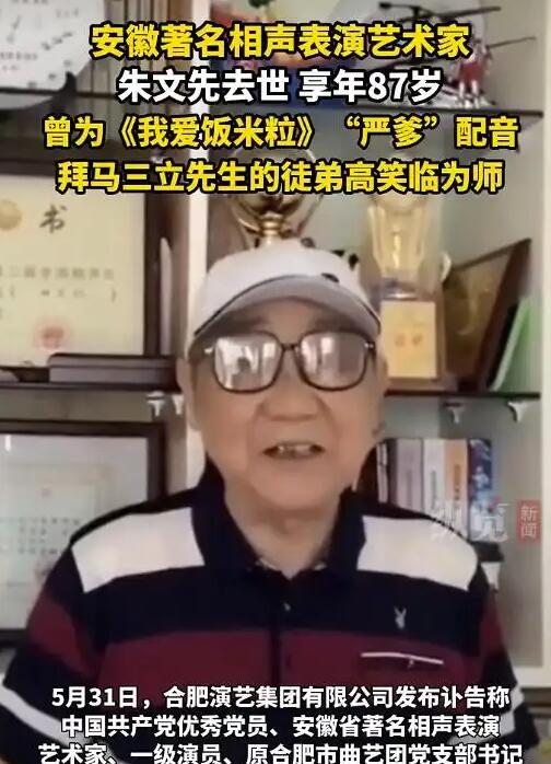 5月31日,合肥演艺集团有限公司发布讣告称,中国共产党优秀党员、安徽省著名相声表演艺术家、一级演员、原合肥市曲艺团党支部书记朱文先同志,因病医治无效,于2025年5月31日上午9时12分在合肥逝世,享年87岁。