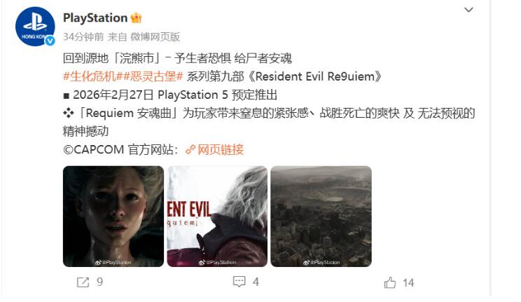 《生化危机9:安魂曲》将于2026年2月27日发售,登陆PC Steam,PS5和Xbox Series X|S。