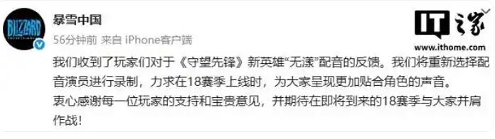 IT之家 8 月 16 日消息,暴雪中国今天下午发布微博表示:我们收到了玩家们对于《守望先锋》新英雄“无漾”配音的反馈。我们将重新选择配音演员进行录制,力求在 18 赛季上线时,为大家呈现更加贴合角色的声音。