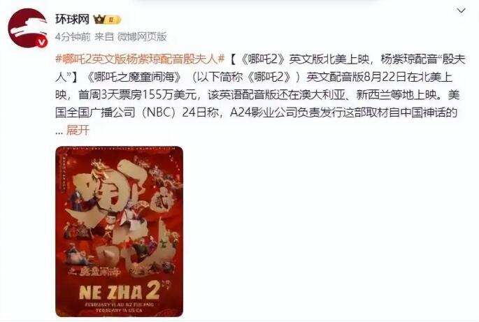 《哪吒之魔童闹海》(以下简称《哪吒2》)英文配音版8月22日在北美上映,首周3天票房155万美元,该英语配音版还在澳大利亚、新西兰等地上映。美国全国广播公司(NBC)24日称,A24影业公司负责发行这部取材自中国神话的爆款电影的英文版本,该片目前是全球票房最高的动画电影,马来西亚华裔演员杨紫琼参与配音。