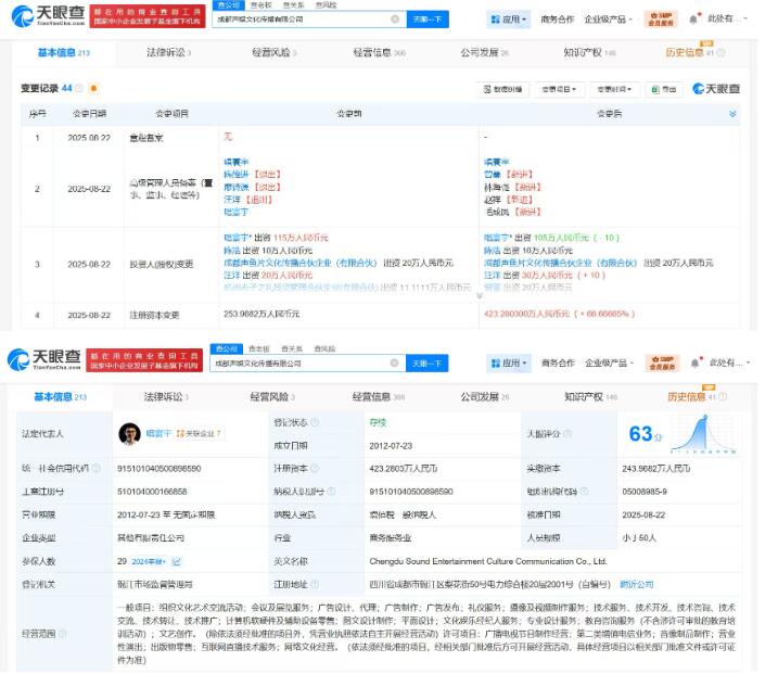 天眼查工商信息显示,近日,成都声娱文化传播有限公司发生工商变更,杭州赤子之礼投资管理合伙企业(有限合伙)、杭州和山前行投资合伙企业(有限合伙)、杭州嘉植投资管理合伙企业(有限合伙)、杭州普鲁同投资有限公司退出股东行列,注册资本由约253.97万人民币增至约423.28万人民币,增幅约67%,同时,多位主要人员也发生变更。