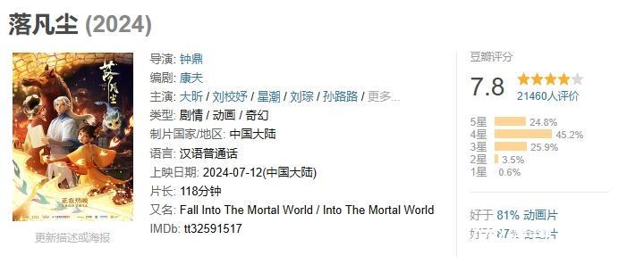《落凡尘》上映至今,虽然排片不多,但获得了不少国产动画迷的认可,豆瓣7.8分更是今年暑期档排名较前的作品。目前,国内涉及神话题材已经过剩,但《落凡尘》还能在观众普遍审美疲劳的现状下,创新性地演绎一个原创故事并获得认可,实属难能可贵。