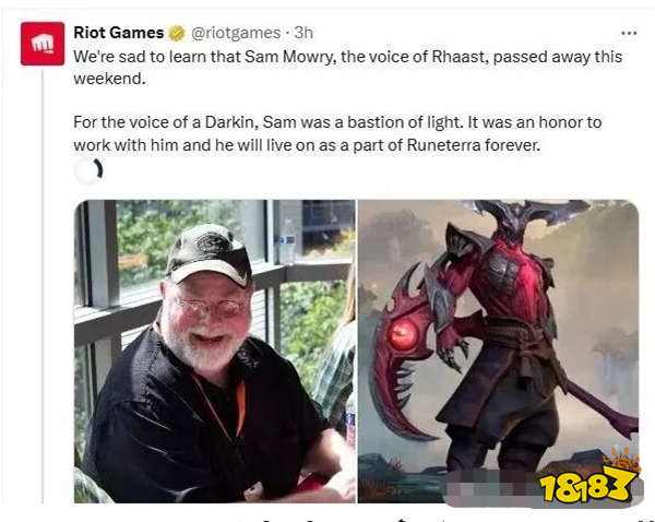 据拳头游戏官方发布的消息,萨姆·莫里于上周末因心脏骤停去世,享年64岁。官方在推特上发文追悼:“我们很遗憾地得知,拉亚斯特的配音演员萨姆·莫里于本周末去世。作为暗裔的配音者,萨姆是光明的捍卫者。能与他共事是我们的荣幸,他将永远成为符文之地的一部分。”这一深情的悼念之词,表达了拳头游戏对萨姆·莫里深深的敬意和怀念之情。