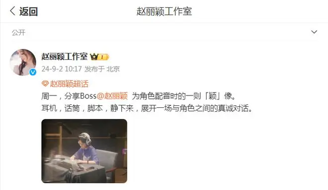 在9月2日星期一,赵丽颖的工作室在10:16分准时在社交平台上发布了一张赵丽颖的照片,并配文:“周一,分享Boss@赵丽颖 为角色配音时的一则「颖」像。耳机,话筒,脚本,静下来,展开一场与角色之间的真诚对话。”
