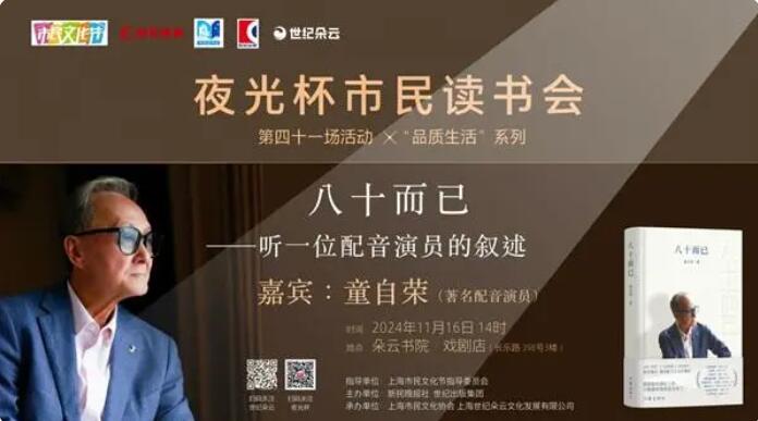 正如童自荣对自己这本书的评价:“我希望老百姓看了这本书能感到一点高兴,一点温暖,一点感动。”这也正是我们在不经意间追求的品质生活,正契合了今年夜光杯市民读书会的总主题“品质生活”。11月16日,在夜光杯市民读书会参与互动的读者,还将获赠童自荣新书《八十而已》或最新的夜光杯文萃《岁月未蹉跎》。本场活动由上海市民文化节指导委员会指导,新民晚报社、世纪出版集团主办,上海市民文化协会、上海世纪朵云文化发展有限公司承办。