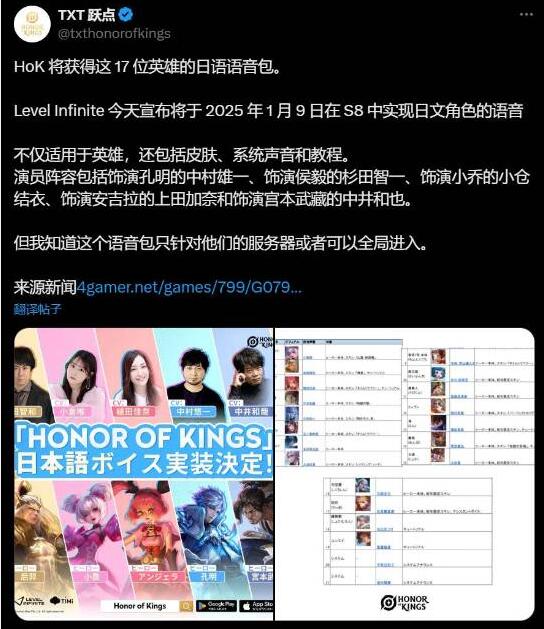 日媒4Gamer报道,腾讯海外发行商Level Infinite于今日宣布,将为《Honor of Kings》(王者荣耀国际服)新增日文配音,计划于1月9日实装。