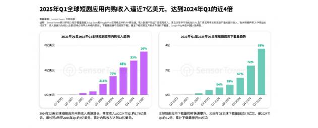 短剧出海的热潮持续涌动。SensorTower数据显示,2025年Q1全球短剧应用内购收入逼近7亿美元,市场规模扩大近4倍。短剧应用下载量同样快速攀升,单季全球下载量超过3.7亿次,是2024年同期的6.2倍。
